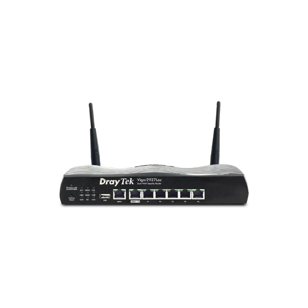 يتميز DrayTek VIGOR2927LAC بوجود منافذ WAN مزدوجة، مما يتيح لك توزيع الحمل بين اتصالات الإنترنت المختلفة لضمان استمرارية الاتصال حتى في حال تعطل أحد الاتصالات. بالإضافة إلى ذلك، يحتوي الراوتر على منافذ SIM مدمجة تدعم تقنية LTE Cat.6، مما يوفر اتصالاً مستقراً وسريعاً عبر شبكة الجوال.