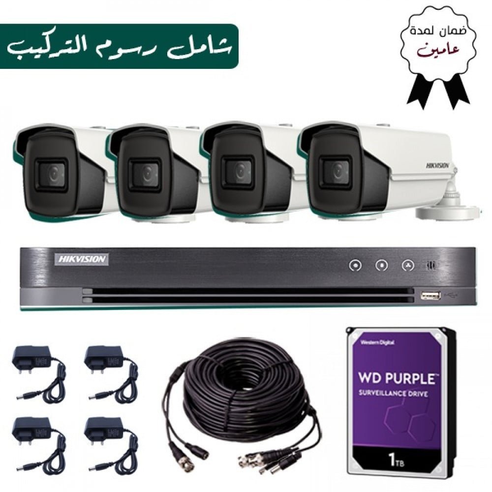 تركيب عدد 2 كاميرة من النوع هيكفيجن بدقة تصوير 8 ميجا بكسل 4K وجهاز تسجيل DVR اربع قنوات بالاضافة الي هارد ديسك سعة 1 تيرا بايت من النوع ويسترن ديجيتال مناسب لكاميرات المراقبة يقوم بالتسجيل علي مدار الساعة بدون توقف مع امكانية زيادة سعة الهارد ديسك في حالة الطلب , العرض يشمل التوريد والتركيب داخل مدينة الرياض بجميع الكابلات المستخدمة لتسليم السيستم كاملا وربطه بالجوال في حالة توفر انترنت , مع ضمان عامين علي الكاميرات والتركيب .