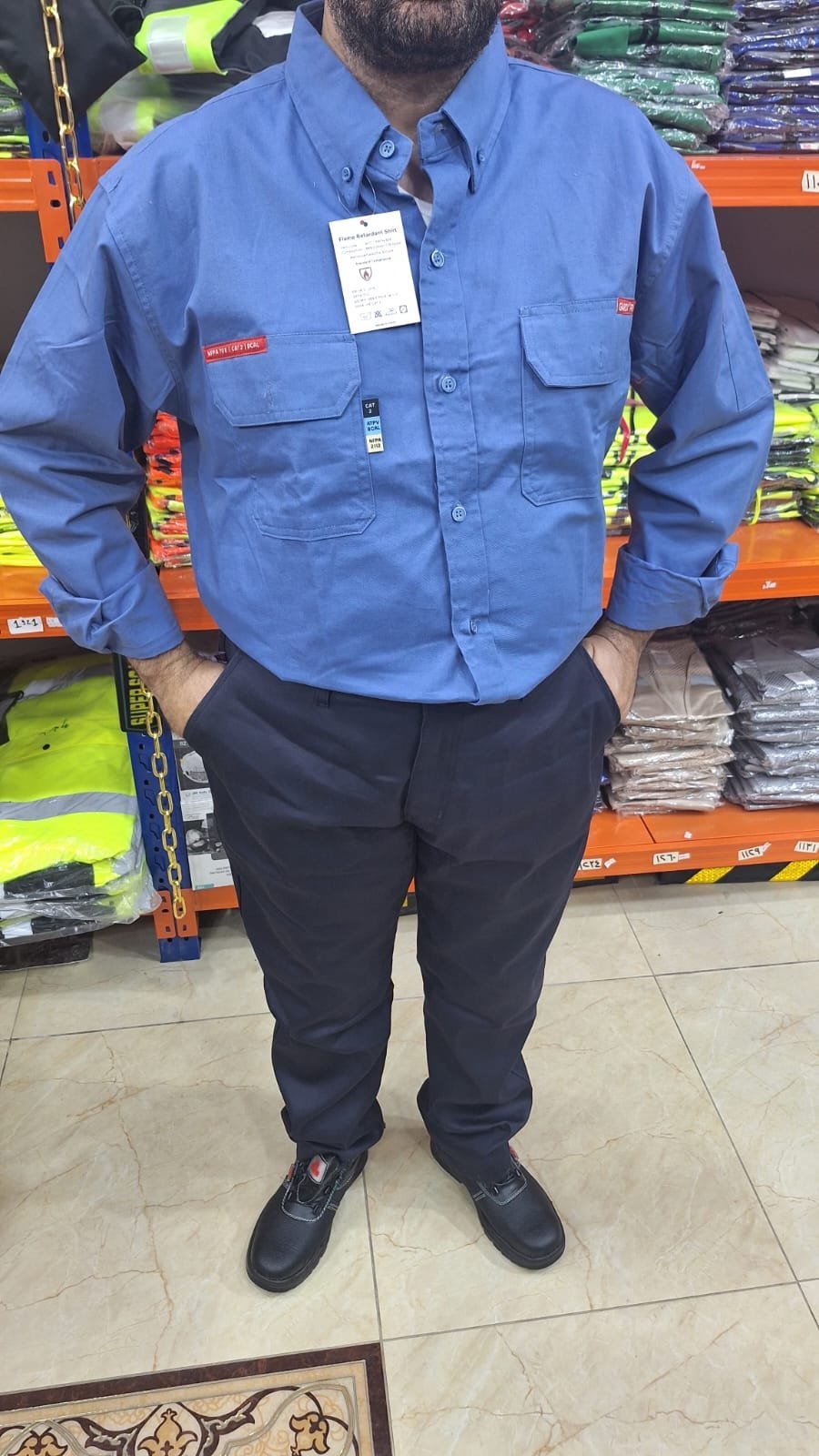 قميص مقاوم للحريق، ملابس CAT2، ملابس مقاومة اللهب، ملابس Arc Flash، ملابس القوس الكهربائي، معدات السلامة، PPE، ملابس عمل كهرباء، Safety Clothing، ملابس مقاومة الحريق في الرياض، ملابس حماية صناعية، أحذية سلامة، Safety Shoes، ملابس CAT1 CAT2