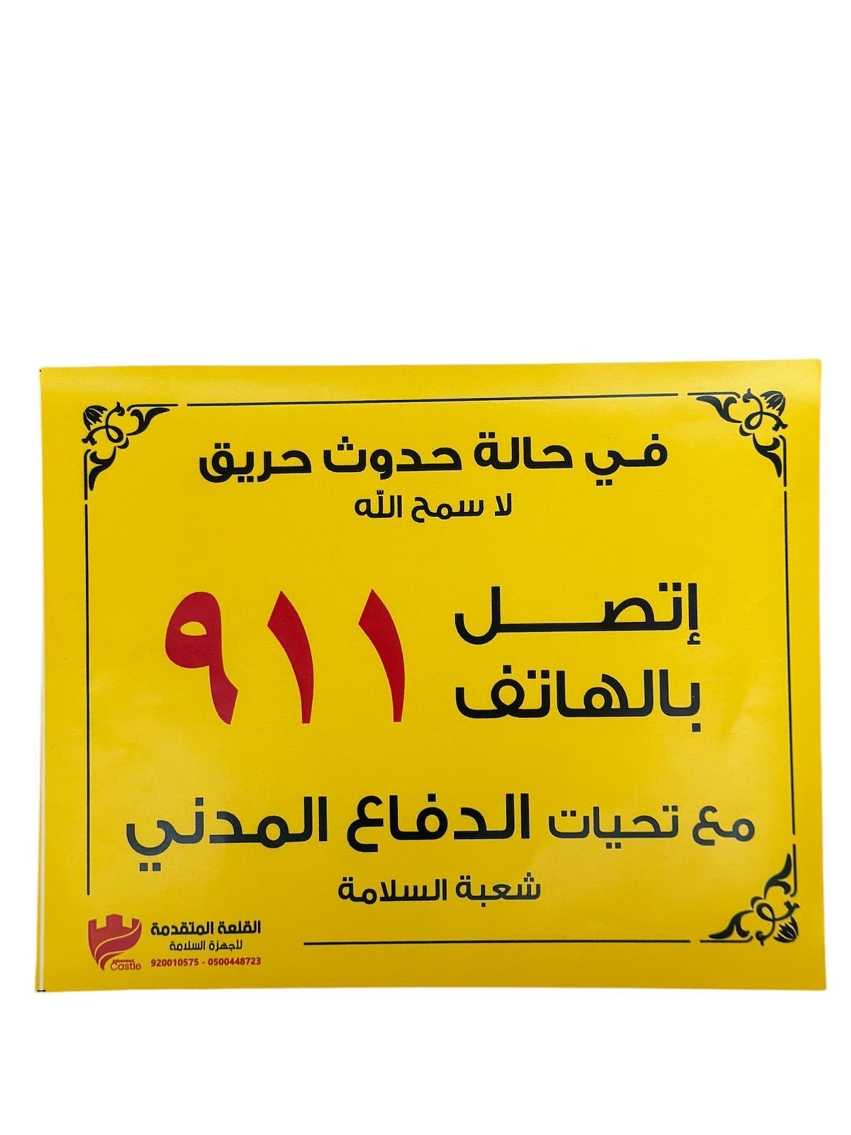 لوحة إرشادية لصق داخلي-تحتوي على رقم التواصل مع الدفاع المدني في حالات الطوارئ 911