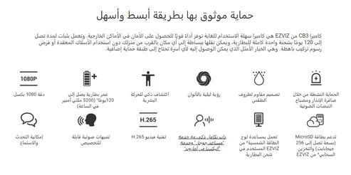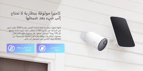 • يعمل مع لوحة شمسية EZVIZ – شحن البطارية باستخدام الطاقة الشمسية.